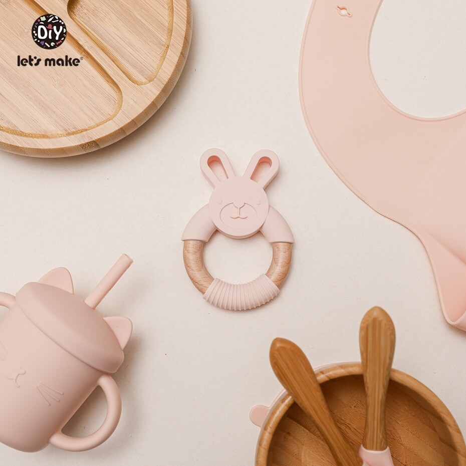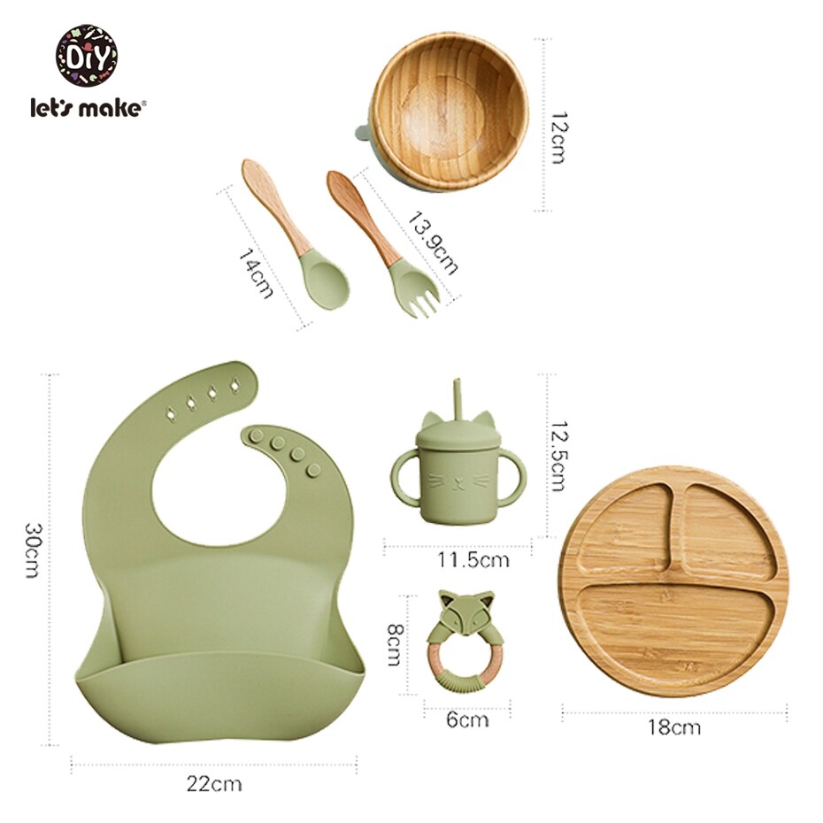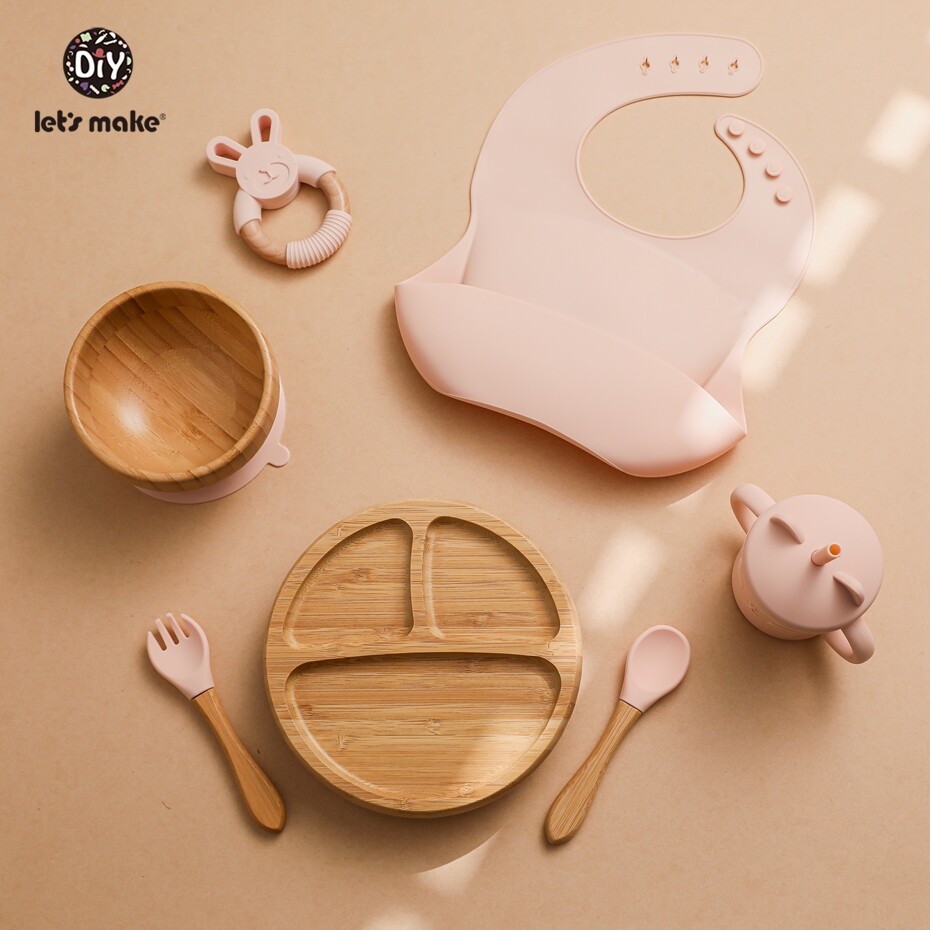 Let's Make Baby Meal Feeding Set 7pcs/set Natural Bamboo Plate,Bowl with Suction 100% Safe Silicone Teether Toy Toddler Gift Set