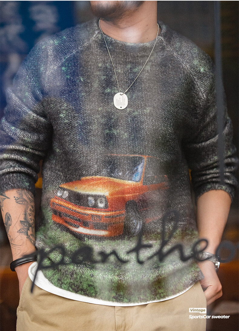 Maden brand Workwear style men hip-hop American 1980S retro sports car print crew neck sweater thick draped knit men academic sweater