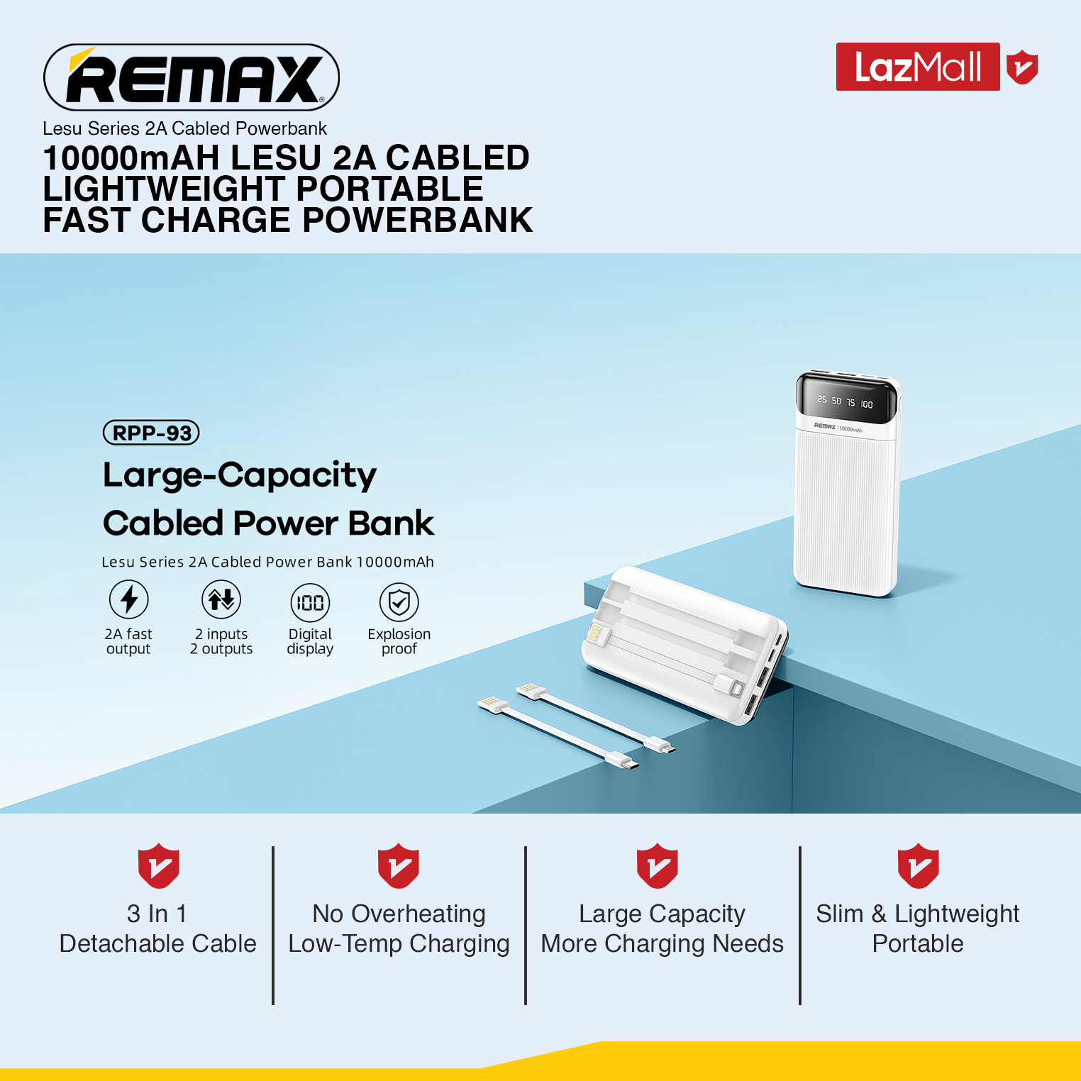 [Remax Energy] RPP-93 Lesu Portable 10000mAh 2A Fast Charge Power Bank with 3-In 1 Cable