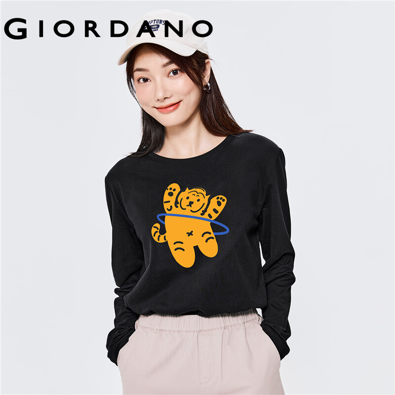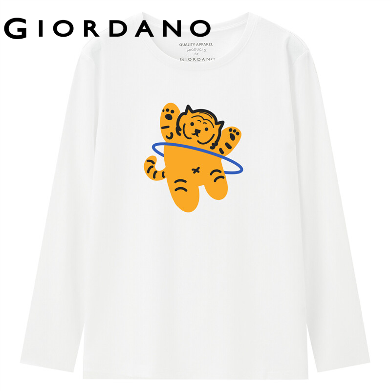 GIORDANO Women ZITA Series T-Shirts Cute Tiger Print 100% Cotton Casual T-Shirts Long Sleeve Spring Fall Simple Tee 99392105