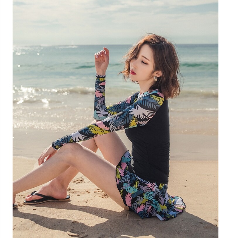2Pcs/set Women Fashion Skirt Swimsuits Women Swimwear Long Sleeves Plus Size Zip Swimming Culottes Suit for Women